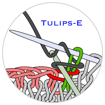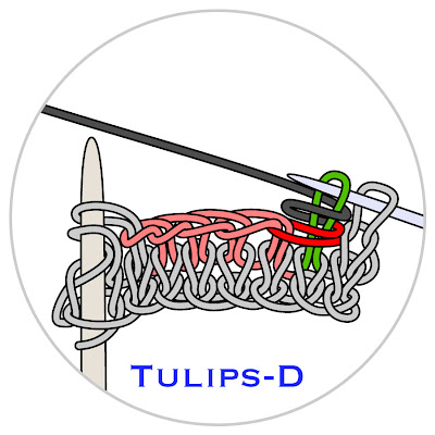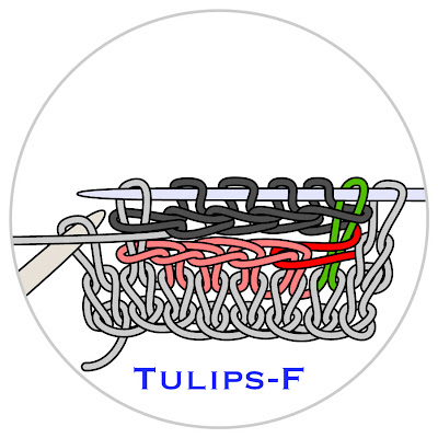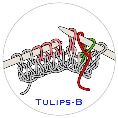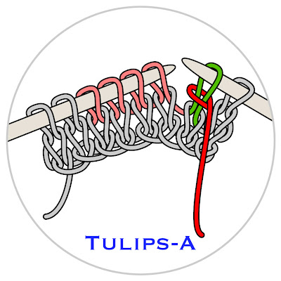 The editor of Interweave Knits, Eunny Jang, made a video about the tulips buttonhole, and you might want to follow along with the video as well as the diagrams--tulips is a bit difficult to work the first few times, because it uses techniques not usually found in knitting. You can click the link above to view via you-tube, or there is a direct link at the bottom of this post.