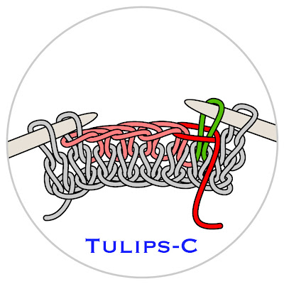 Using dpn’s, knit several rows in stockinette, end purl row, turn work. Next row: Knit 1. Wrap running yarn (red) clockwise around next st (green) as follows * Bring yarn to front. Slip st to R needle, bring yarn to back, return st to L needle, bring yarn to front again. Return st to R needle. * Per illustration Tulips-A, the green st at the working tip of the R needle now has the running yarn wrapped clockwise around its neck but it has not been knit. Drop the running yarn, it will not be used again until step 3.