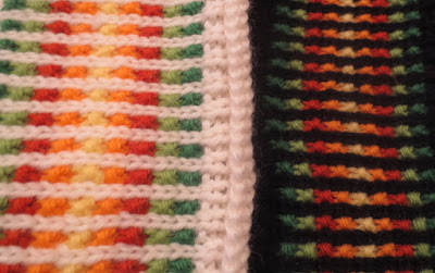 In these photos I have dropped the fifth column from the LEFT edge on the front (purple) fabric, and the matching column (fifth column from the RIGHT on the back (green) fabric. The ladder stops a few stitches from the bottom, so it doesn't tangle with the cast-on.