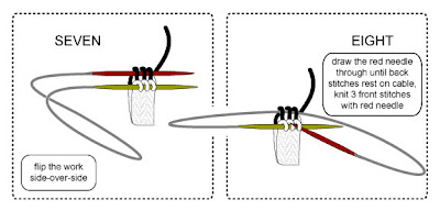 step 6: (above)To get to this configuration from step 5, draw the green needle (the needle now loose) rightwards, so the back stitches which were on the cable, will be resting on the green needle instead, as illustrated.