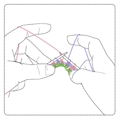 *USE WHICHEVER METHOD YOU'RE BETTER AT (continental or English) for whichever color there is the most of--this will give you the best overall tension. Use the unfamiliar hand to work the contrasting yarn. It is for this reason that the first post in this series recommended choosing a beginning pattern with one clearly dominant main color, and only a relatively small amount of the contrasting color.