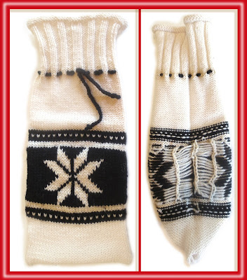 I knit the above sample because hot water bottles are the ultimate in hard-to-dress items. They are made of a grabby, almost sticky rubber; they have two-sharpish edges; they feature a small flange on the bottom--in other words, they feature lots of stuff for floats to get caught on. Aaaaaand, to make dressing the hot water bottle even harder, I designed this cover with two large snowflake motifs, widely separated--one on the front and one on the back. This means the floats don't touch down anywhere between the snowflakes, but instead have to go a lo-o-o-ng way, around a 180 degree bend, to get from place to place. This design features 11 rows of 26-stitch-long floats. I think that if you can get a knitted cover--featuring super long floats which go around a corner--onto a hot water bottle, you can pretty much be assured these floats can handle anything.