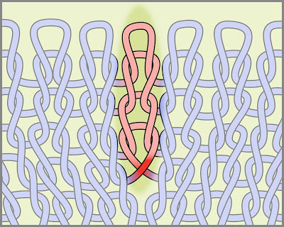 Figure 10 --A: Instead of purling the (darker blue) stitch adjoining the last (darker purple) knit stitch, slip that stitch instead: this parks a (red) strand on the fabric surface. --B: Purl the next (lighter blue) purl stitch --C: on the following round, when you come to the red strand, purl the first (darker blue) purl stitch using the red strand, NOT the running yarn. Then, purl the next (lighter blue) purl stitch. --D: Because you did not use the running yarn to knit the (darker blue) purl stitch in step C, that running yarn has formed a new (red) strand parked on the fabric surface. --Repeat steps C and D every round, wherever there is purl (blue) next to a knit column (purple). |